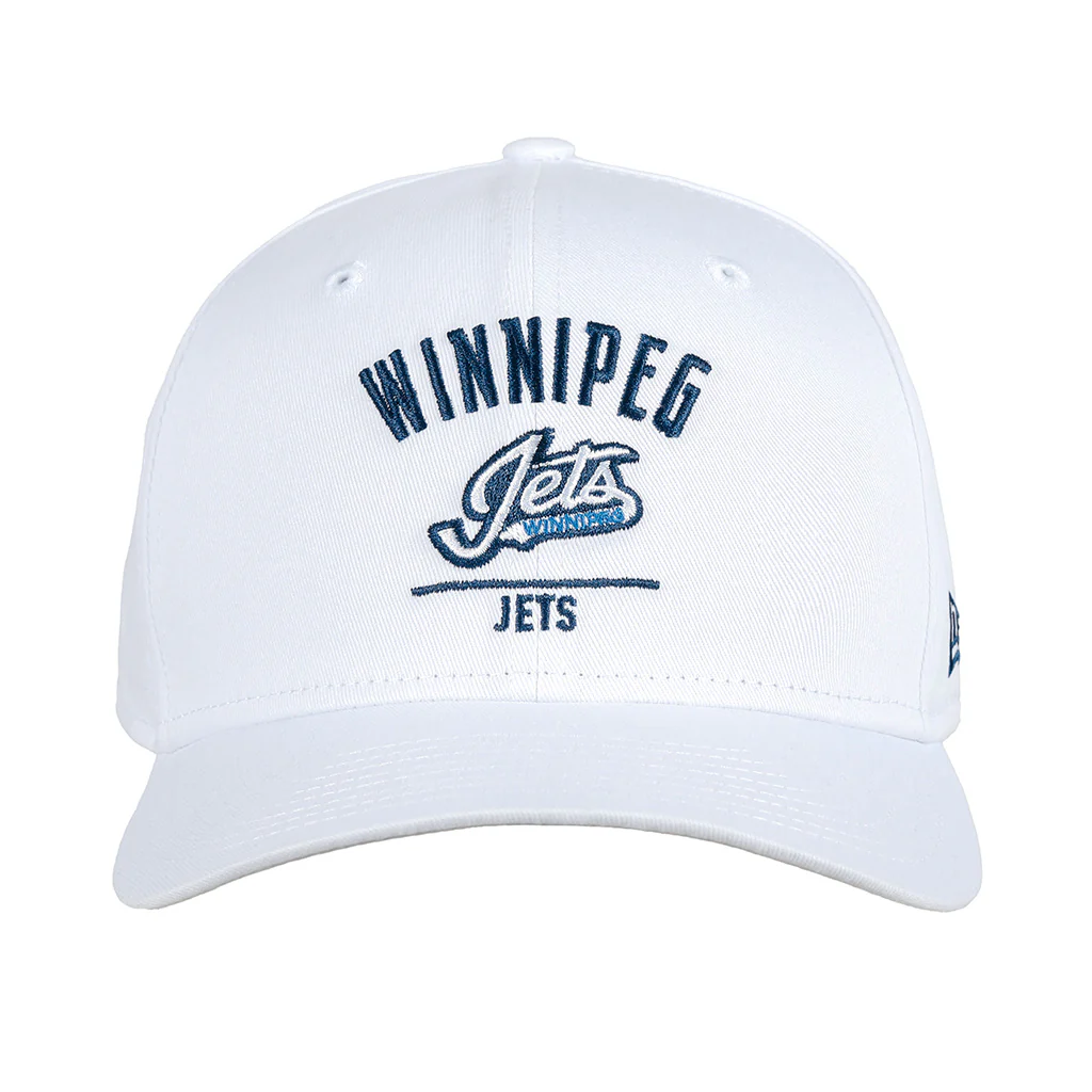 The Winnipeg Jets 9SEVENTY Stretch-Snap Wordmark Arch Cap in white features an embroidered Jets wordmark logo at the front panels with an adjustable snapback closure at the rear.