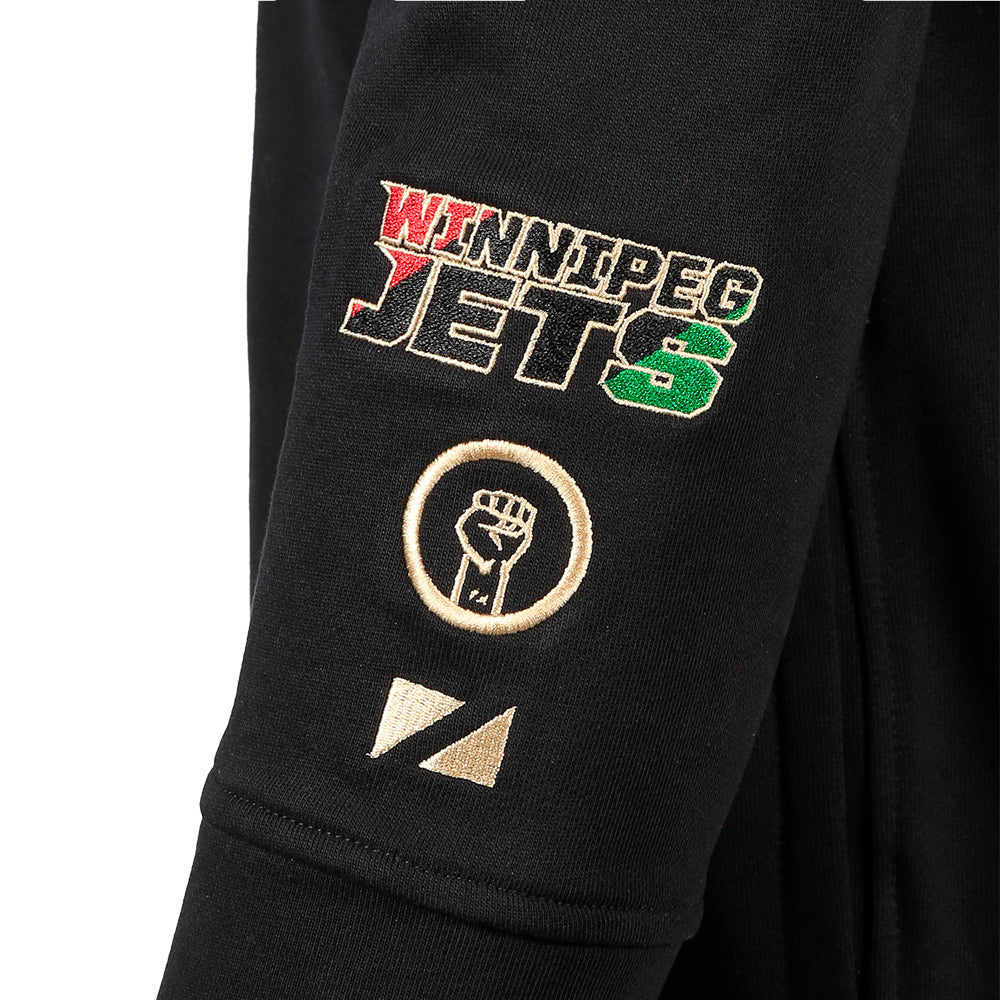 A collaboration between the Jets and local premium athletic apparel brand Zueike features this Black History Night Hood, exclusively at Jets Gear and TrueNorthShop.com.  The Jets logo emblazoned in colours often used in their community - Black represents the people of the African diaspora, Red their bloodshed, past and present, Green is for the abundant natural resources of the African continent, and Gold for prosperity. This collection represents optimism, justice, and equality for all.